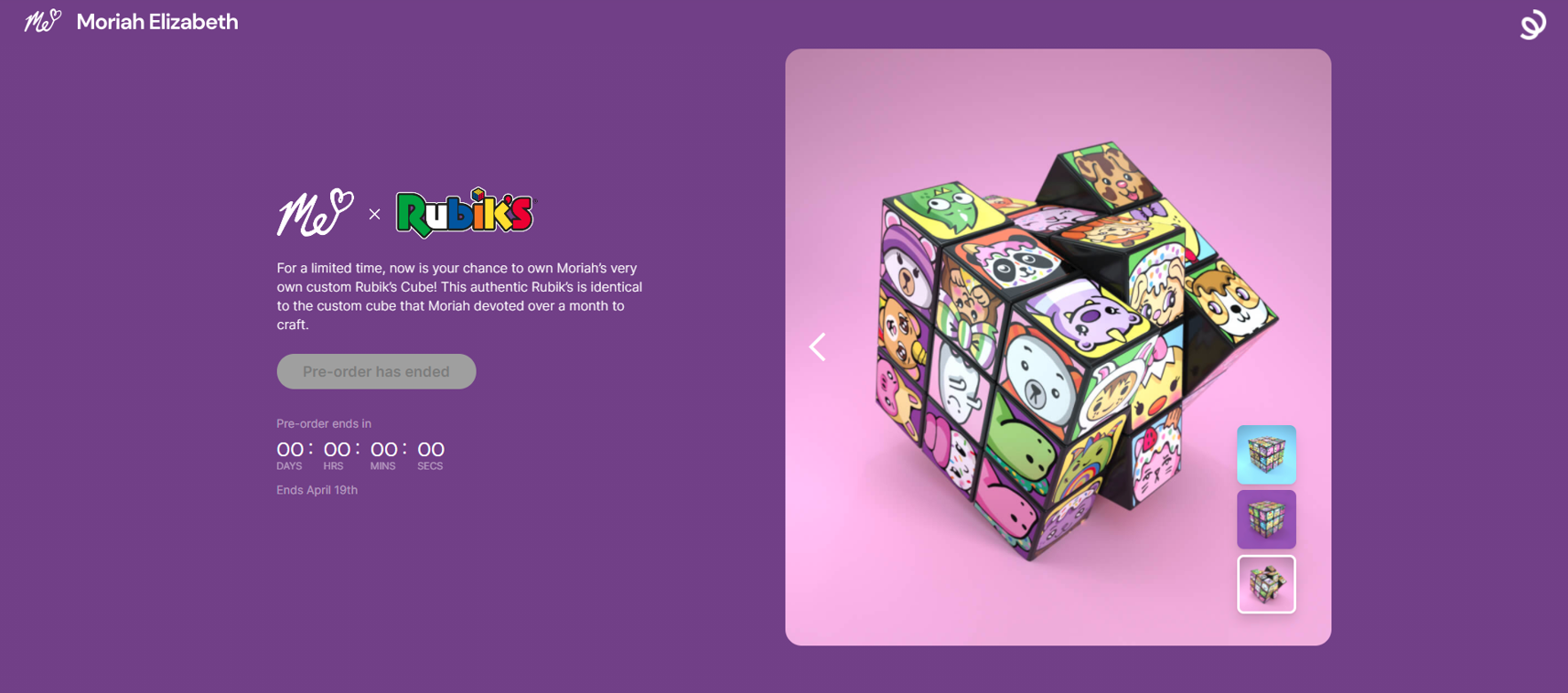 RUBIKSCreated for Moriah Elizabeth in association with Rubiks. Moriah Elizabeth is a successful YouTuber, illustrator, craft maker and artist. With a global online following of over 6.5 million. I helped with a suit of videos and static renders for the creation of the website launching her new collaborative Rubiks cube product.